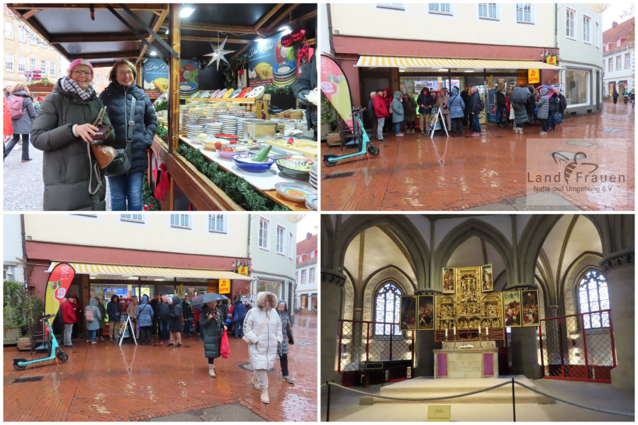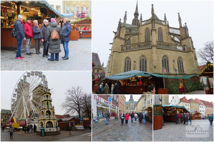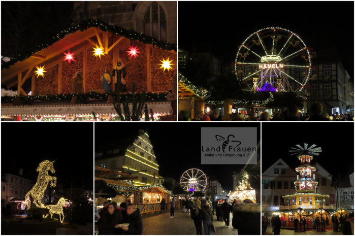Am 26. November fuhren die LandFrauen teilweise mit Partnern und Gäste, insgesamt 60 Personen, mit 2 Bussen nach Hameln. Dort gab es eine Führung durch die Stadt mit vielen Details zur Rattenfänger-Sage. Ein Glühwein gehörte auf dem Weihnachtsmarkt dazu. Im Hotel, das in der Altstadt lag gab es ein schönes Buffet und im Anschluss hatte man nochmal die Möglichkeit den Weihnachtsmarkt zu besuchen. Nach dem Frühstück am nächsten Morgen ging die Fahrt nach Osnabrück. Dort war es anfangs noch etwas trocken aber bald fing es unangenehm an zu regnen. Man war schließlich froh als man im Bus saß und in Richtung Heimat fuhr.